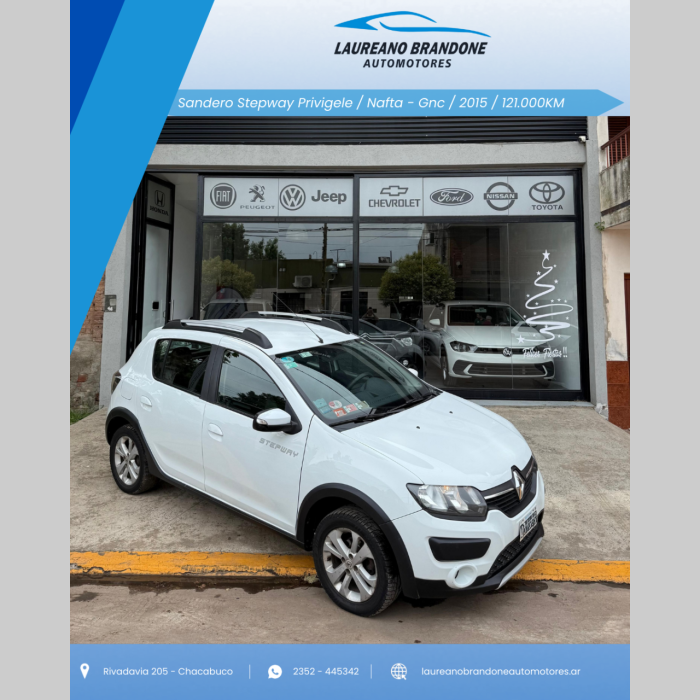 RENAULT SANDERO STEPWAY PRIVILEGE 📅 Año: 2015 📍 121.000 km | Nafta - Gnc ⚙️ Motor 1.6 | Caja manual (MT) ✨ Compacto, económico y muy ágil para ciudad. 📌 Rivadavia 205 – Chacabuco 💰 Financiación disponible | Tomamos tu usado 📞 Consultas al 2352 445342
