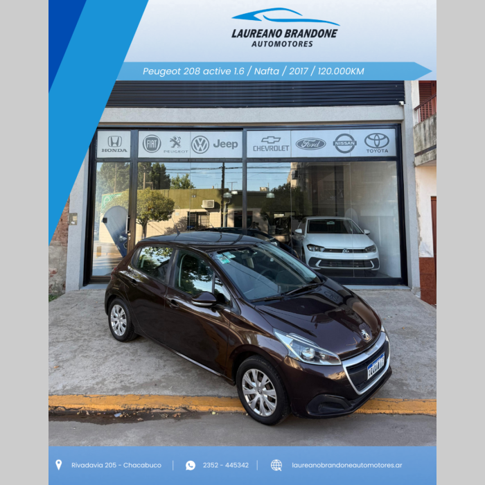 PEUGEOT 208 Active 1.6 📅 Año: 2017 📍 120.000 km | Nafta ⚙️ Motor 1.6 | Caja manual (MT) ✨ Compacto, económico y muy ágil para ciudad. 📌 Rivadavia 205 – Chacabuco 💰 Financiación disponible | Tomamos tu usado 📞 Consultas al 2352 445342