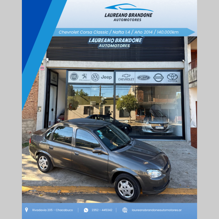🚗 Chevrolet Corsa Classic 📅 Año: 2014 | 140.000 km | Nafta - GNC ⚙️ Motor 1.4 | Caja manual ✨ Económico y práctico, una opción confiable para el día a día. 🚙 Equipado con GNC, ideal para reducir costos de uso. 📌 Rivadavia 205 – Chacabuco 💰 Financiación disponible | Tomamos tu usado 📞 Consultas al 2352 445342