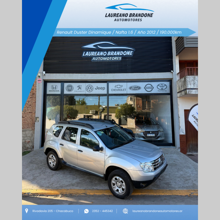 🚗 Renault Duster Dynamique 1.6 📅 Año: 2011 | 190.000 km | Nafta ⚙️ Motor 1.6 | Caja manual ✨ SUV cómoda y confiable, ideal para el uso diario y viajes. Buena altura y manejo ágil. 🚙 Interior amplio y práctico, con buen desempeño tanto en ciudad como en ruta. 📌 Rivadavia 205 – Chacabuco 💰 Financiación disponible | Tomamos tu usado 📞 Consultas al 2352 445342