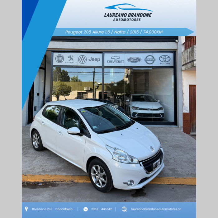 PEUGEOT 208 ALLURE 📅 Año: 2015 📍 74.000 km | Nafta ⚙️ Motor 1.5 | Caja manual (MT) ✨ Compacto, económico y muy ágil para ciudad. 📌 Rivadavia 205 – Chacabuco 💰 Financiación disponible | Tomamos tu usado 📞 Consultas al 2352 445342